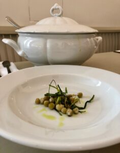 Ceci venant après une roborative soupe aux pois, typiquement locale. C’est toute une soupière qui est arrivée à table, à charge pour moi de faire comme à la maison…