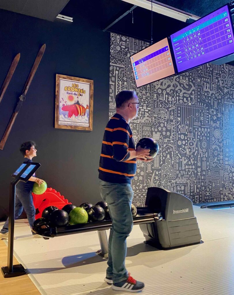Ou plutôt l’univers #swingbowling, où on attend son tour sur une balançoire ? Finalement, j’ai opté pour #toutschuss, où on s’installe sur un télésiège, entre deux pistes… de bowling, juste à côté d’une paire de ski et d’une photo du film Les Bronzés font du ski.