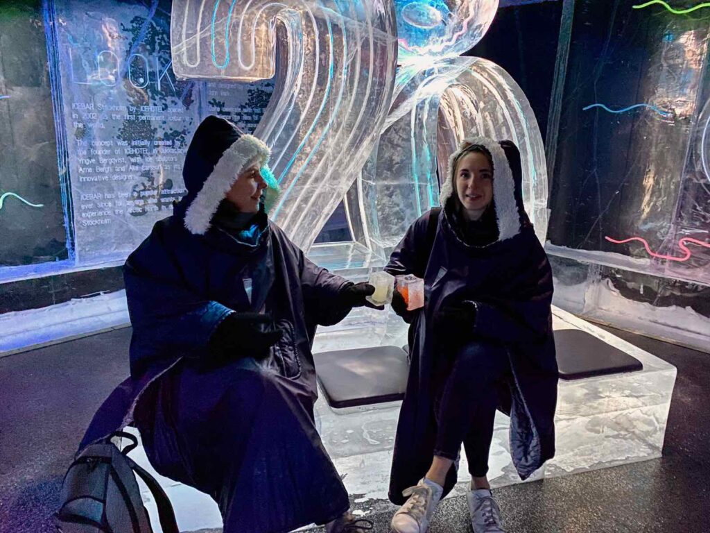 L’Ice Bar se trouve à l’intérieur de l’Hotel C, un hôtel design du quartier de Norrmalm. Avant d’entrer dans le cœur du sujet, passage par la boutique, où on vous prêtera gants et cape spéciale anti-froid.