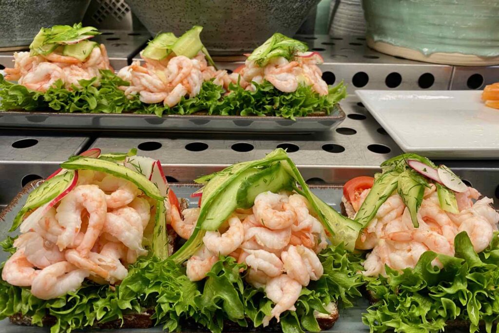 Pour éviter de trop dépenser à l’heure du déjeuner dans cette ville, où la vie est plus chère que chez nous, adoptez le très suédois smörgås. Une tartine, souvent de pain foncé, couverte de crevettes, saumon, avocat ou toute autre chose bien fraîche.
