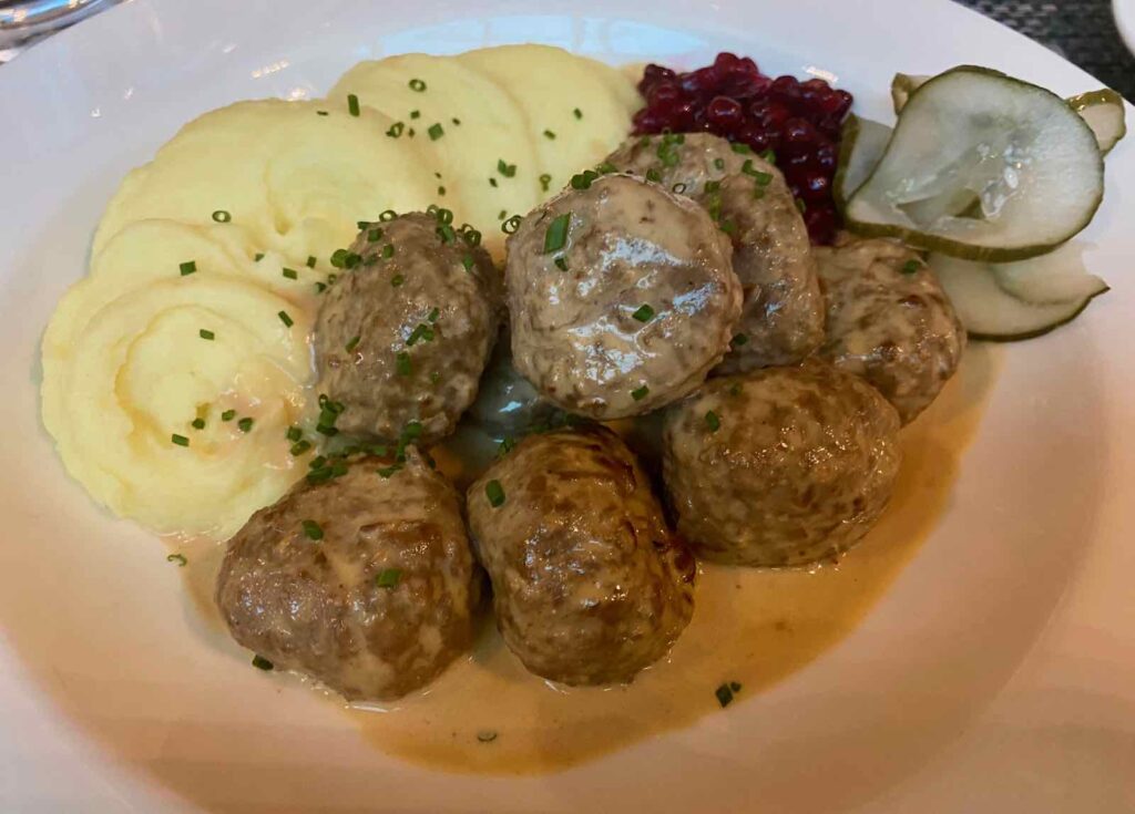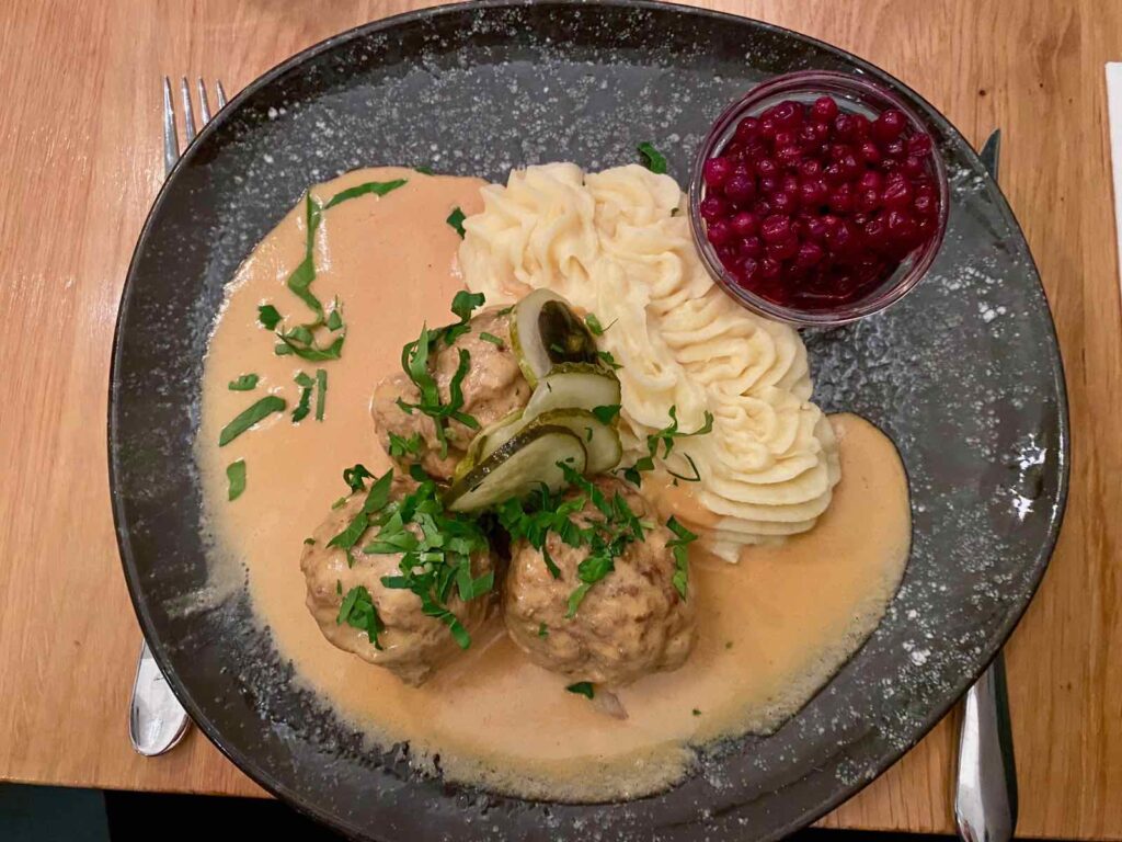 Pour un vrai déjeuner ou dîner, tentez aussi les boulettes de viande, mon plat favori à Stockholm. Toujours avec une purée, des airelles et une excellente petite sauce crème…