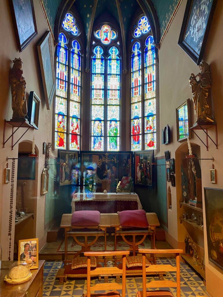 L’intérieur est resté totalement intact et on admirera les meubles, les vitraux, les lustres, les escaliers et les cheminées exécutés avec brio par des artisans locaux, toujours en harmonie avec l’architecture néo-gothique. L’ensemble forme d’ailleurs ce qu’on appelle une œuvre d’art totale. Ce qui ne l’empêche pas d’être également moderne : le château est équipé à la fois d’eau courante et de chauffage central.