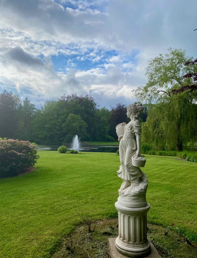 Des jardins médiévaux entremêlés d’Art Nouveau, de formes fluides et de teintes pastel, conçus avec Mien Ruys, paysagiste néerlandais de renom. Un hectare de jardin posé au milieu de quatre hectares de parc, eux-mêmes enserrés dans un paysage de polders.