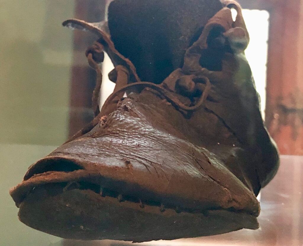 Je ne sais plus trop dans quelle salle j’ai photographié cette chaussure. Mais cette godasse qui a traversé les siècles, après avoir foulé le pavé brugeois, m’a beaucoup émue. Ah si elle pouvait parler…