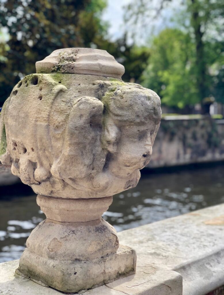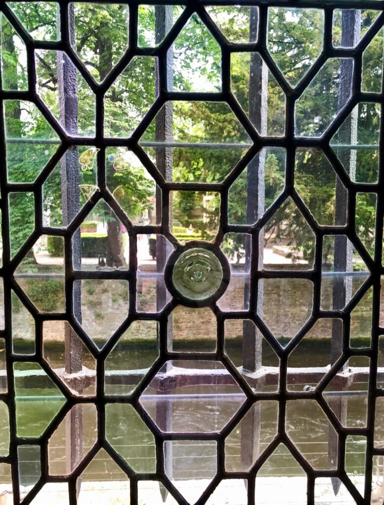 Et pour finir, voici la vue offerte sur la terrasse de l’étage supérieur. De paisibles jardins, l’église, le pont Saint-Boniface. Avec, en prime ce jour-là, un vrai ciel flamand. Comme une ultime parenthèse de beauté offerte par le musée Gruuthuse…