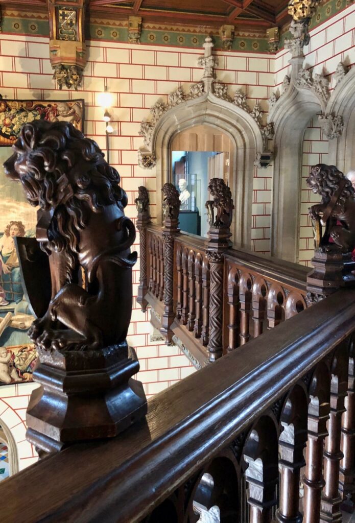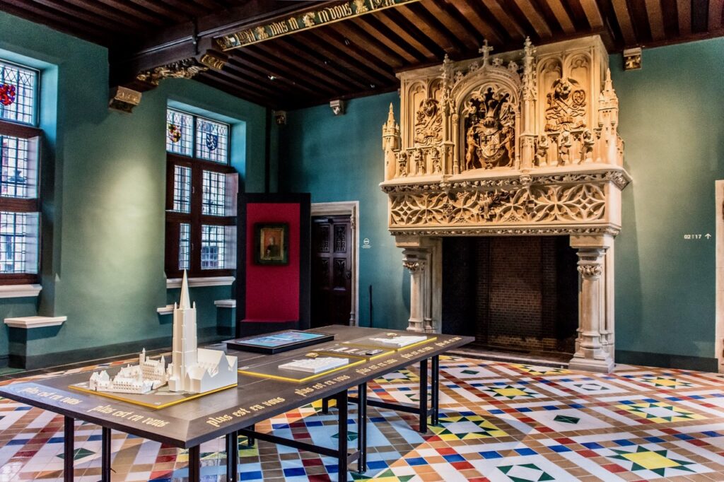 Maintenant qu’on a fait le tour de la cour, il est temps d’entrer dans ce palais urbain, dont on découvre immédiatement la magnificence. Plafond en bois sculpté, balcon orné de lions, tapisserie murale… malgré les travaux successifs, l’entrée en dit déjà long sur le seigneur Louis de Gruuthuse, un temps au service des ducs de Bourgogne.
