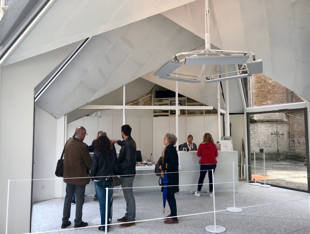 Avant même d’entrer au musée Gruuthuse, c’est un peu LE sujet du jour. Que penser du pavillon contemporain, construit entre le musée et l’église Notre-Dame (Onze-Lieve-Vrouwekerk en flamand), où on achète les billets pour les deux sites mais aussi pour les autres sites de Musea Brugge ?