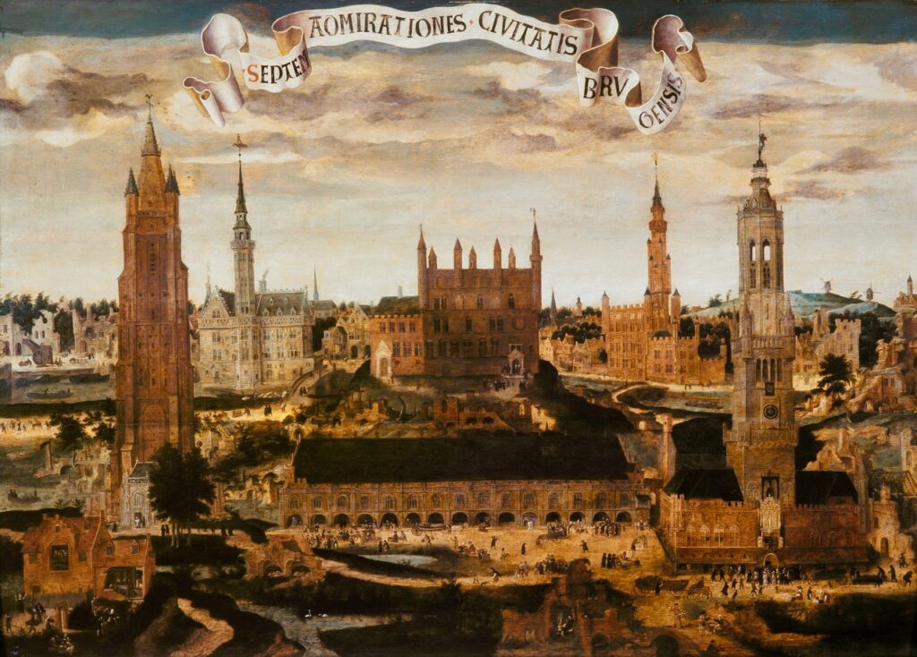 Ce tableau intitulé Les Sept Merveilles de Bruges, réalisé par Pieter Claeissens vers 1550/1560, le prouve. À l’époque, Bruges brille déjà par son architecture et ses bâtiments d’une grande richesse.