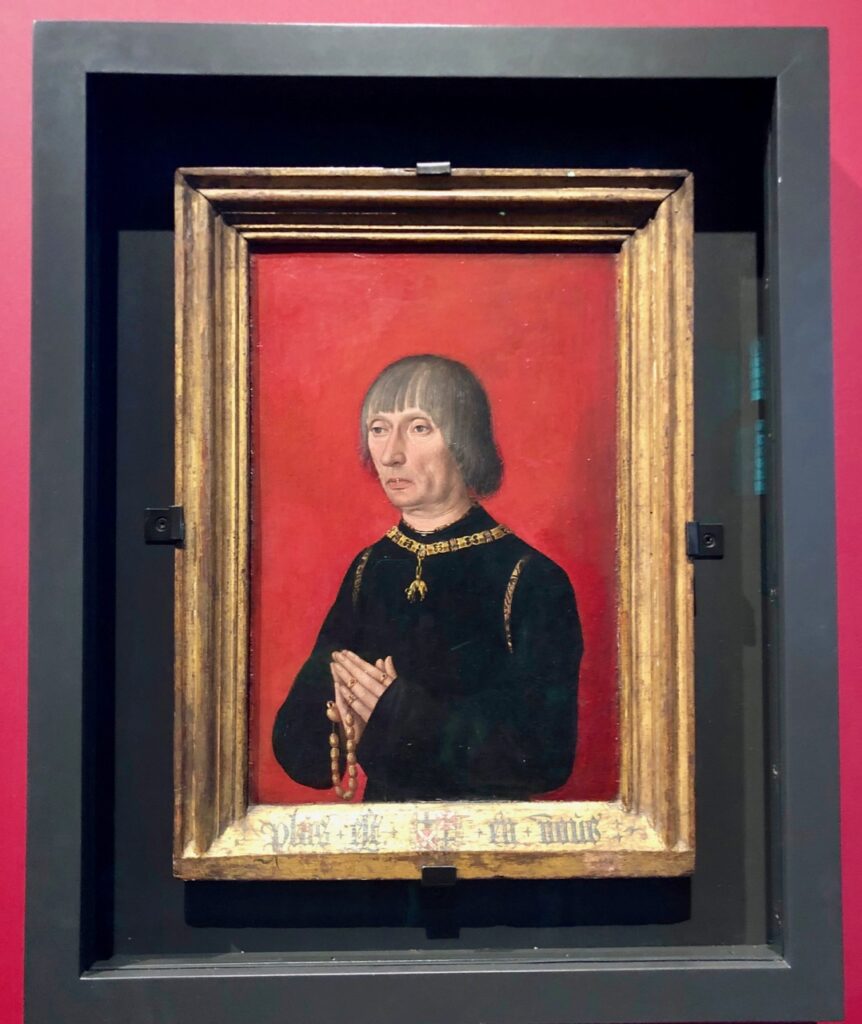 On entre dans la première salle du musée Gruuthuse et le voici ce Louis de Gruuthuse, représenté sur un portrait réalisé en 1480. Pas très avenant le bonhomme ? Pourtant, il avait quelques raisons d’être satisfait de son sort ! Homme d’affaires, diplomate, chevalier et amateur d’art éclairé, il appartenait à une famille disposant du monopole commercial sur le gruut, ingrédient de base dans la fabrication de la bière. Pas trop à plaindre donc ce cher Louis !