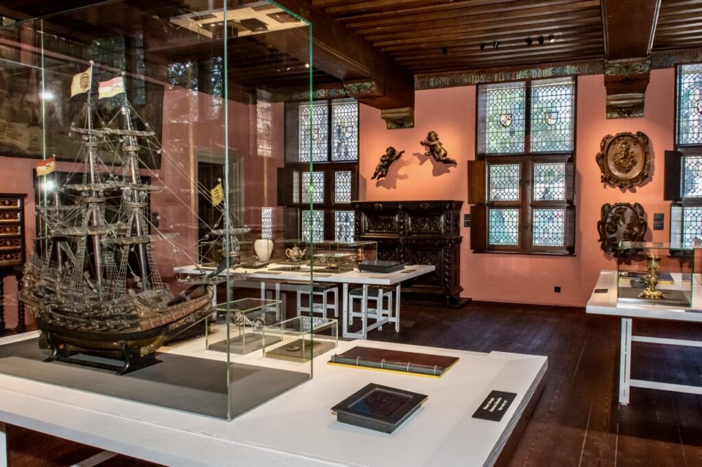 Mais le musée Gruuthuse ne se contente pas de rappeler le contexte politique et économique de l’époque bourguignonne. Il s’attarde aussi sur le luxe qui régnait en ce temps-là dans les maisons particulières, en présentant des objets de la vie quotidienne. Bijoux, flacons, jouets, coffres, vaisselle…