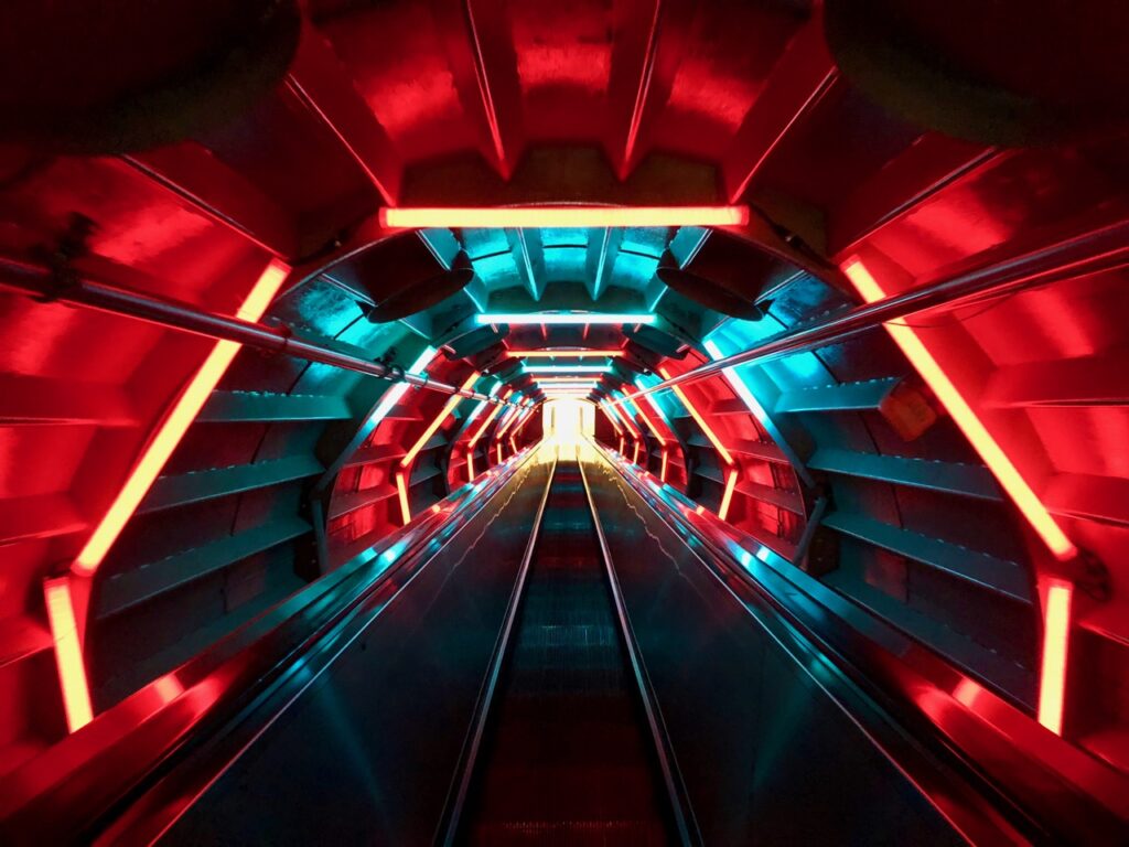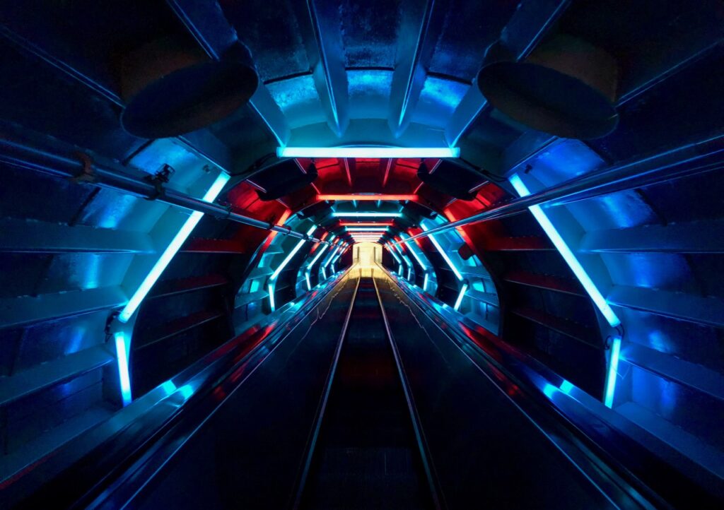 Je ne sais plus très bien à quel niveau cela se passe. Mais petits et grands s’amusent aussi de cette descente entre deux boules, aux airs de Guerre des étoiles. Une descente longue et assez vertigineuse, qui laisse tout le temps d’admirer changements de couleurs et d’ambiances…
