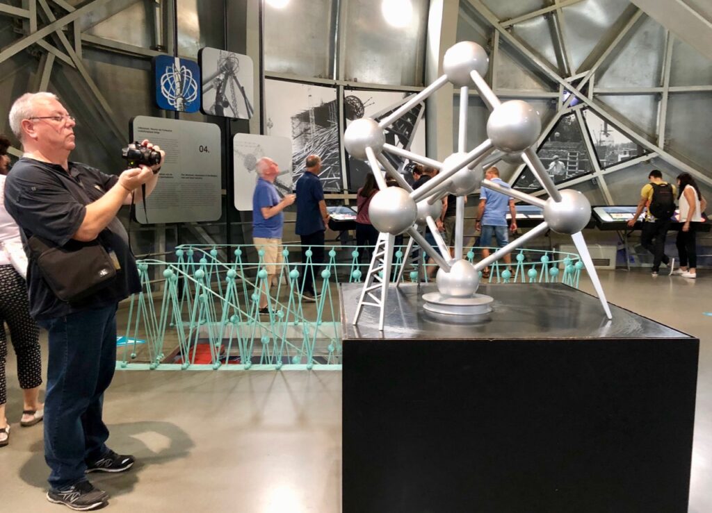Alors juste pour faire le malin dans la voiture devant les enfants, avant d’arriver à destination, voici quelques chiffres. L’atomium mesure 102 mètres de haut et compte 9 boules. Mais pour faire chic, on dit plutôt sphères. Chacune a un diamètre de 18 mètres et trois seulement font partie de la visite. Trois autres sont des boules techniques, tandis que les 3 dernières sont réservées aux événements et aux enfants des écoles (qui peuvent même y dormir !)