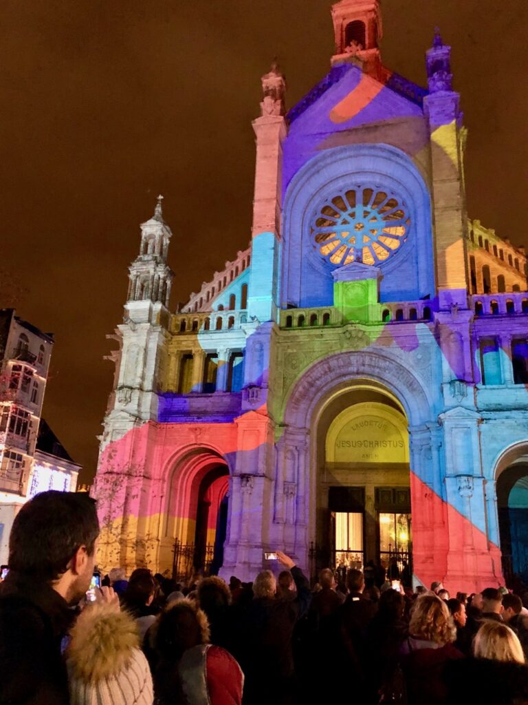 Mais cette année, je suis allée à Bruxelles en train et je dois avouer que j’ai manqué le spectacle son et lumière sur la Grand Place pour cause de dernier train trop précoce. J’avais pourtant très envie de découvrir ce vidéo-mapping projeté sur la tour de l’Hôtel de ville et intitulé Echoes of Colors. À défaut, et même si ce n’est pas le même spectacle, je vous donne une photo de ce beffroi habillé de couleur, issue de mes archives des années précédentes.
