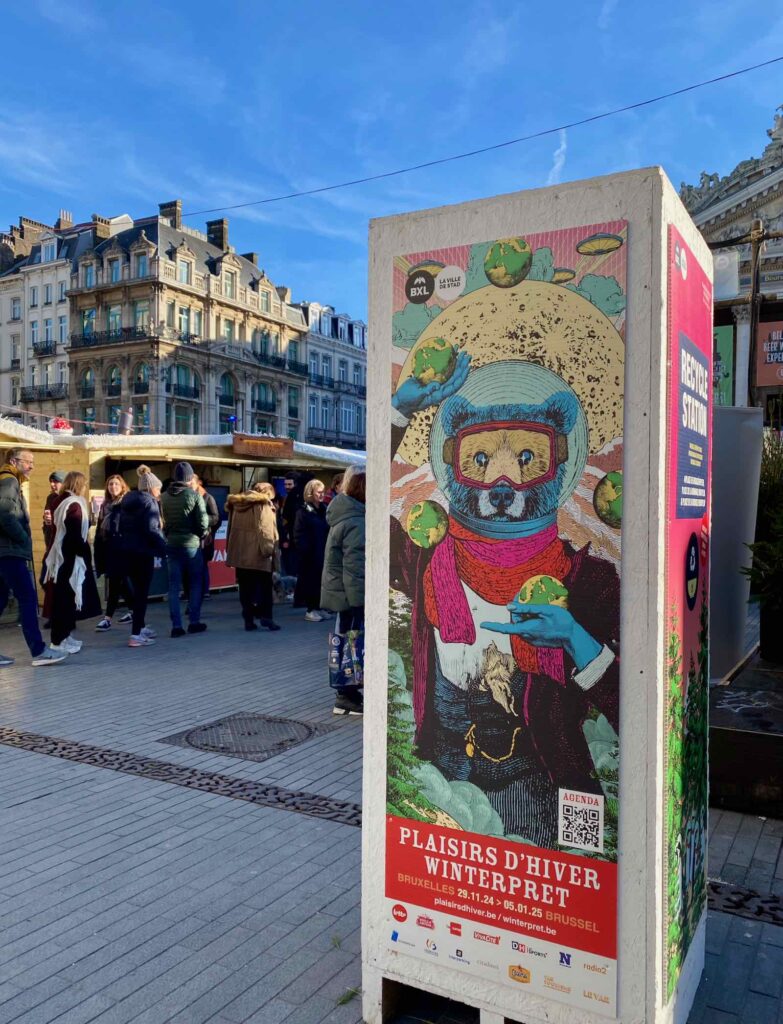 Sinon, j’ai beaucoup aimé l’affiche de cette édition 2024 de Plaisirs d’hiver. Elle est signée par l’artiste bruxellois Elzo Durt, un graphiste-illustrateur qui mêle surréalisme et pop art dans ses compositions joyeuses et colorées. On la trouve un peu partout en ville, notamment sur les grandes « boîtes » contenant les toilettes publiques. Alors ouvrez l’œil…