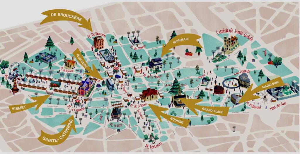 Jusqu’au 5 janvier 2025, dans le centre de Bruxelles, entre la Grand Place (à l’est) et les quais du Bois à brûler et aux Briques (à l’ouest). Voir plan ci-dessus.