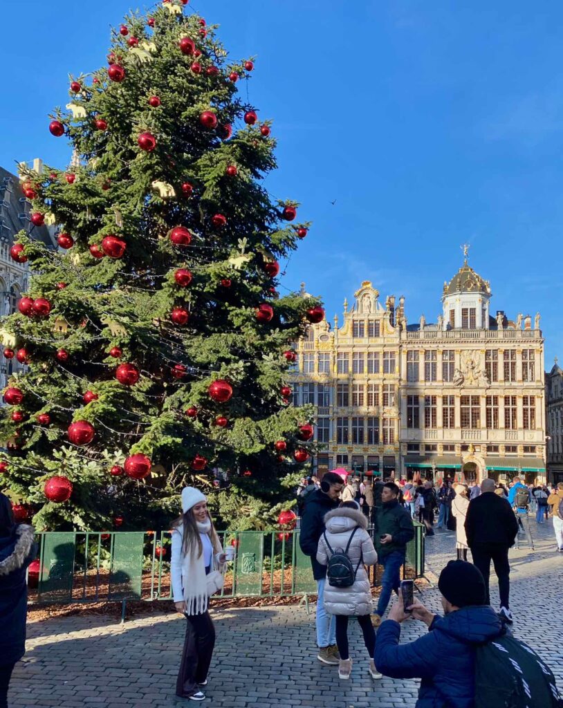 Sur la Grand Place, on trouve bien sûr le majestueux sapin de Noël, symbole des festivités. Coupé le 20 novembre, il a été érigé sur la place principale dès le lendemain et décoré de boules rouges et de petits éléphants, en référence au partenariat avec la marque Côte d’Or. Je n’ai malheureusement pas de photo à vous montrer de son illumination (en rouge), ayant quitté le centre de Bruxelles juste avant l’inauguration et sa première mise en lumière. Mais le voici de jour et ce n’est pas mal non plus…