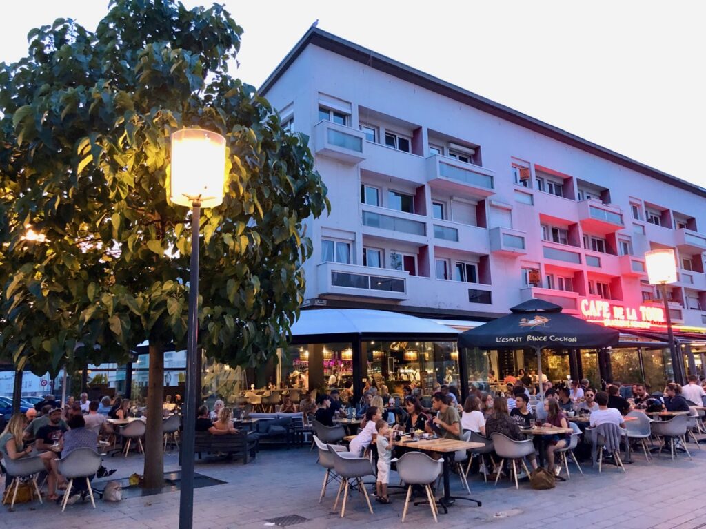 Je ne sais pas ce que valent les plats de cette brasserie de la place d’Armes. Ce qui nous a amenées ici, c’est la grande terrasse qui, en cette fin d’été, prenait ses aises sur le large trottoir, au soleil couchant.