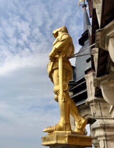 Et s’il vous reste du temps et de l’envie, explorez aussi l’intérieur du beffroi. On y admire un vitrail coloré, évoquant le départ des Anglais, qui éclaire l’escalier d’honneur.