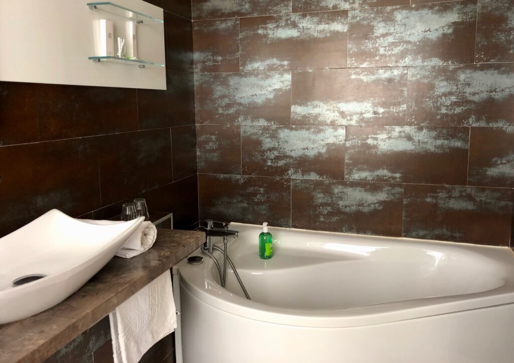 Les salles de bain ont douche à l’italienne ou baignoire, Isabelle réservant, quand c’est possible, les chambres avec baignoire aux dames…