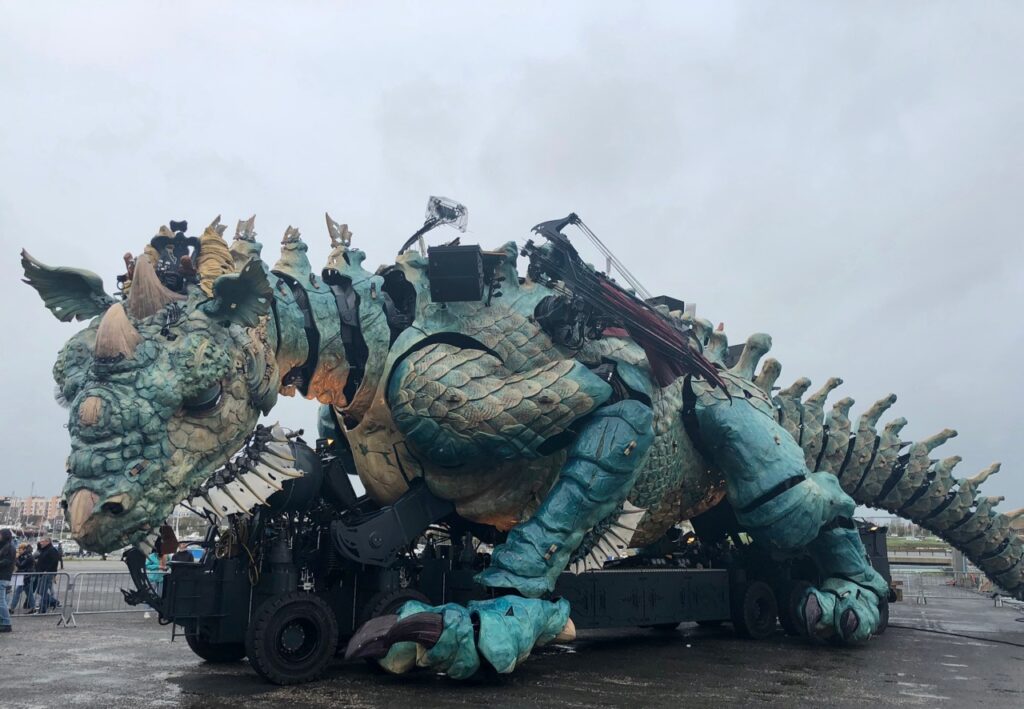 La nouvelle création de la compagnie La Machine, un Dragon monumental d’acier et de bois sculpté, aux dimensions impressionnantes (25 mètres de long et 15 de haut, pour 72 tonnes) peut embarquer 50 personnes sur son dos pour un voyage d’une vingtaine de minutes, sur le front de mer de Calais.