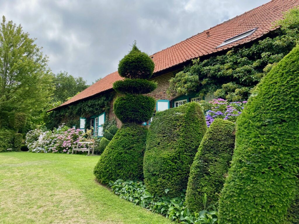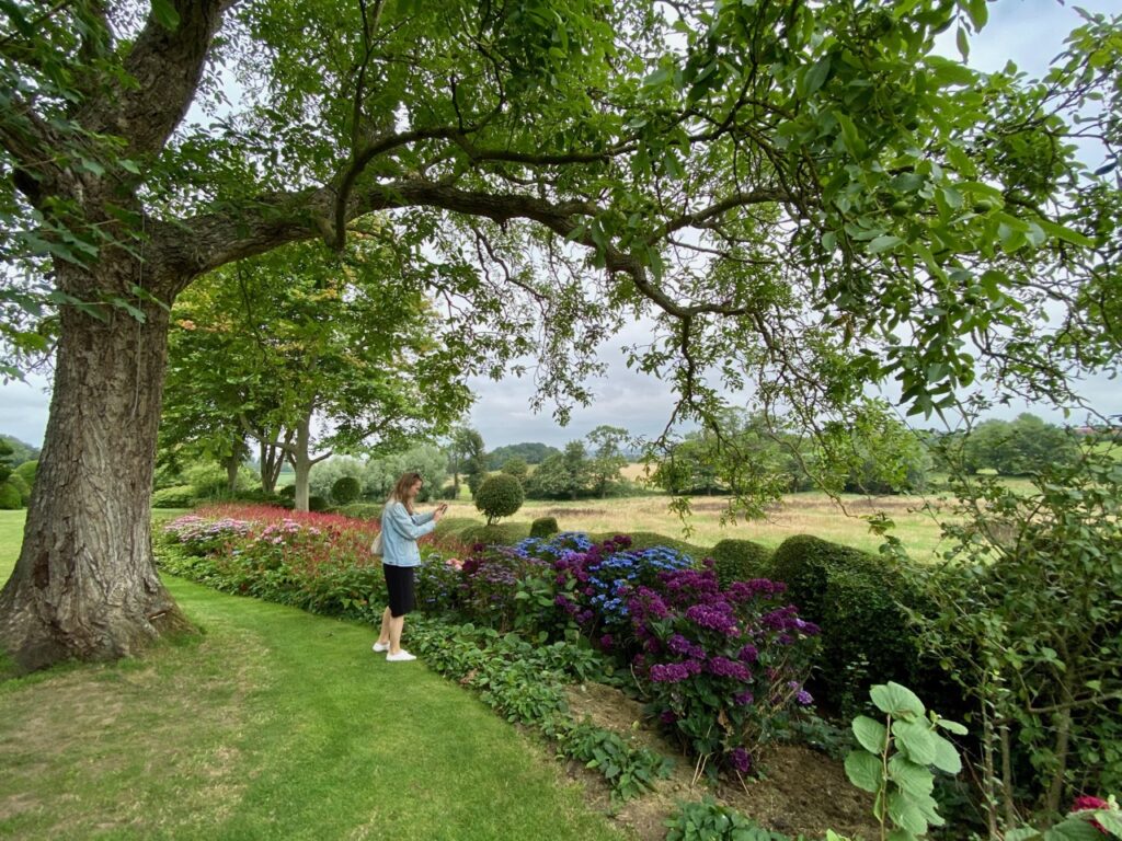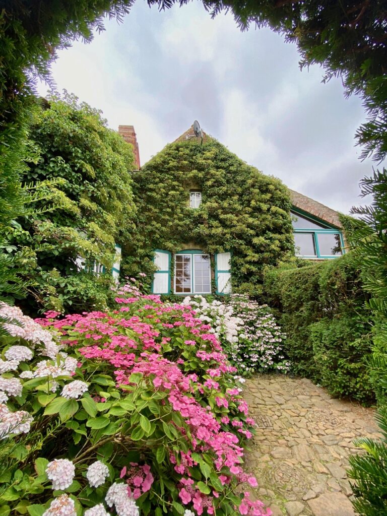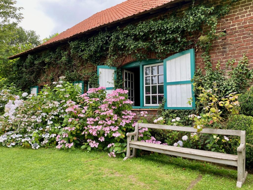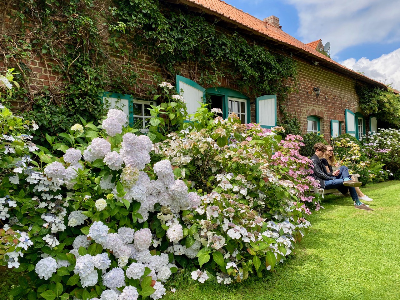 Les massifs d’hortensias (et pas qu’eux) courent aussi de l’autre côté de la chambre, ourlant l’arrière de la ferme en brique. Un banc tend les bras aux visiteurs, leur offrant une pause pour mieux admirer toute cette beauté.