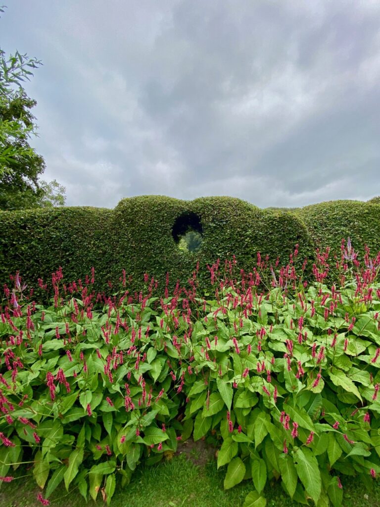 L’image la plus connue du Jardin du Mont des Récollets est celle de l’ancienne ferme flamande (sans doute du XVIIe), ouverte autour d’une cour en forme de L. Et ses magnifiques ifs taillés en topiaires. Juste derrière, j’ai beaucoup aimé ce passage, comme un couloir entre ifs et hortensias blancs. Simplicité et beauté…