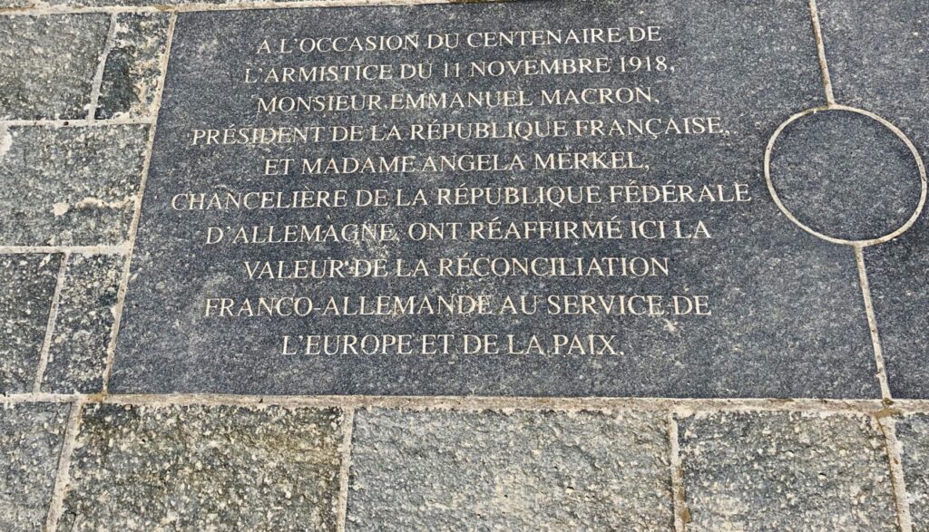 Au centre de la clairière, il y a, c’est vrai, une immense dalle sur laquelle est gravée ce message : « Ici, le 11 novembre 1918, succomba le criminel orgueil de l’empire allemand, vaincu par les peuples libres qu’il prétendait asservir ».