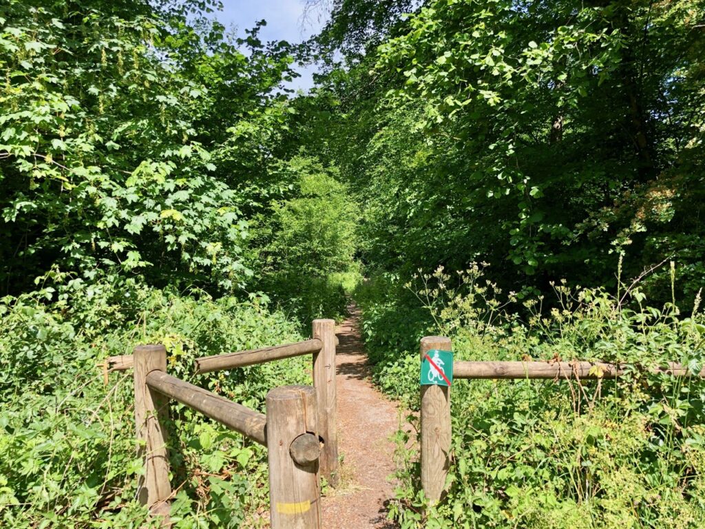 Quelques (dizaines de ?) mètres après le départ, n’oubliez pas de tourner à droite et d’emprunter cet étroit chemin, interdit aux cyclistes…