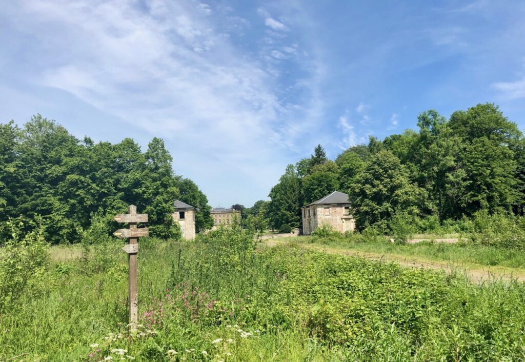 Là, vous apercevrez plus d’une fois les dépendances du château et vous longerez pendant un moment le mur d’enceinte de la propriété.
