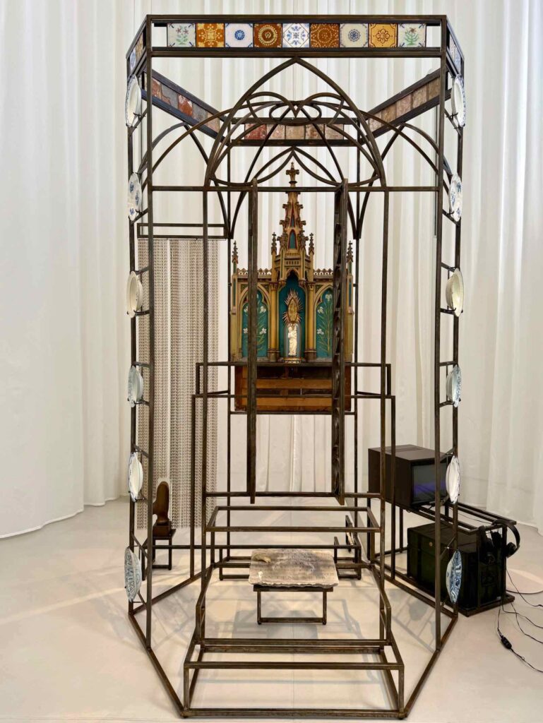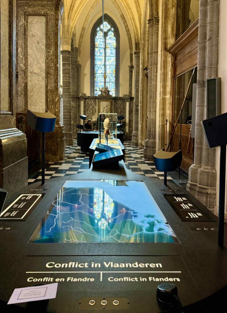 Puis, à l’extérieur de la chapelle, une table interactive de 12 mètres de long propose de creuser un peu plus le sujet. Habiller un chevalier de sa tenue d’apparat, suivre l’évolution du conflit ou comprendre comment un chevalier français et un tisserand flamand ont vécu la bataille : ces expériences en apprennent plus sur cet épisode qui fait, encore aujourd’hui, la fierté de Courtrai.