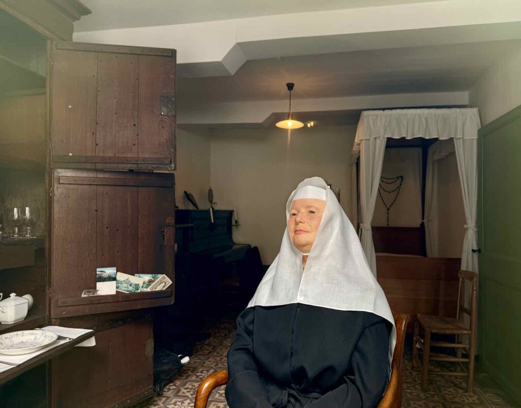 Mais il reste pourtant une béguine (factice mais plus vraie que nature !), qui guette le passage des visiteurs, installée derrière une vitre, dans un intérieur d’époque.