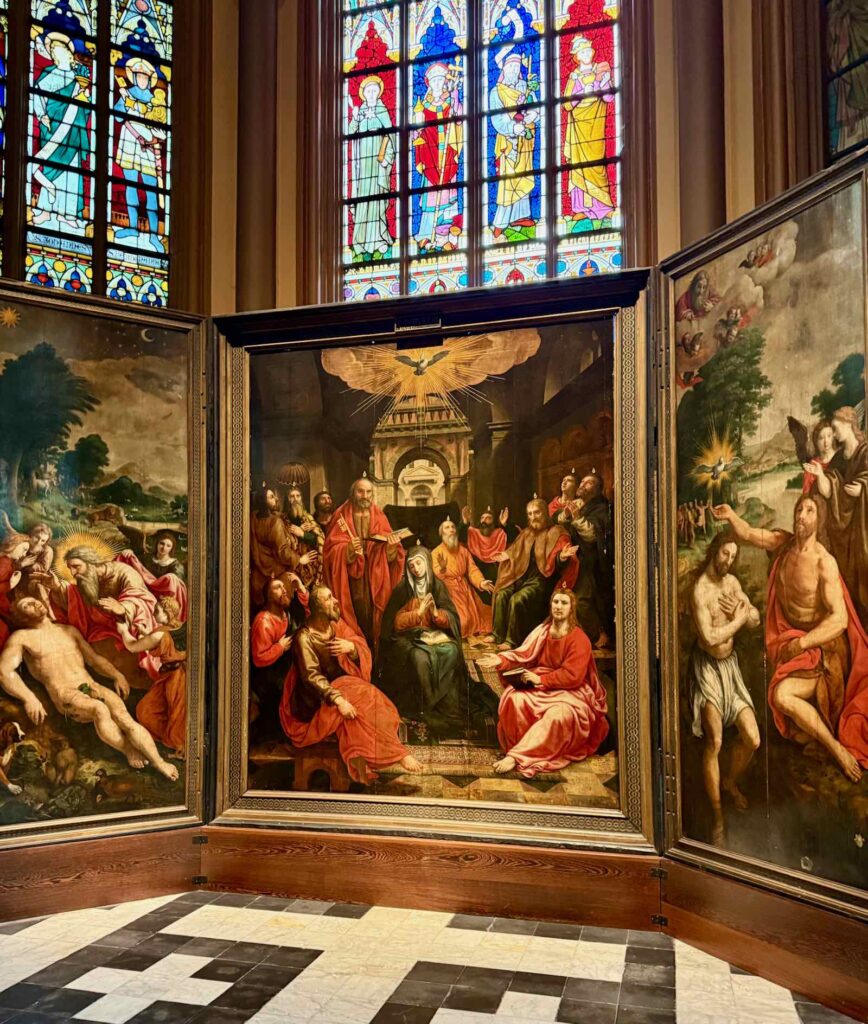 Construite, détruite, reconstruite et transformée au fil des siècles, l’église Saint-Martin abrite diverses œuvres d’art. Joyau d’entre les joyaux ? Le Triptyque du Saint-Esprit, de Bernard de Rijckere, représentant une scène de Pentecôte, encadrée par le baptême de Jésus et la création d’Adam.