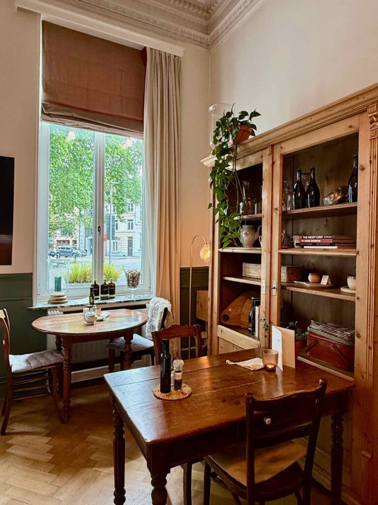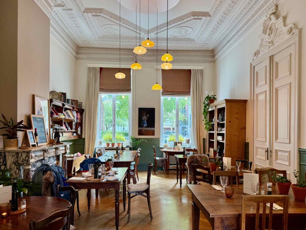 Sous de hauts plafonds moulurés, la déco a un petit côté « école à l’ancienne », avec des étagères de livres et des tables en bois. L’ensemble est plein de charme avec, en plus, la possibilité de manger dans le jardin aux beaux jours.