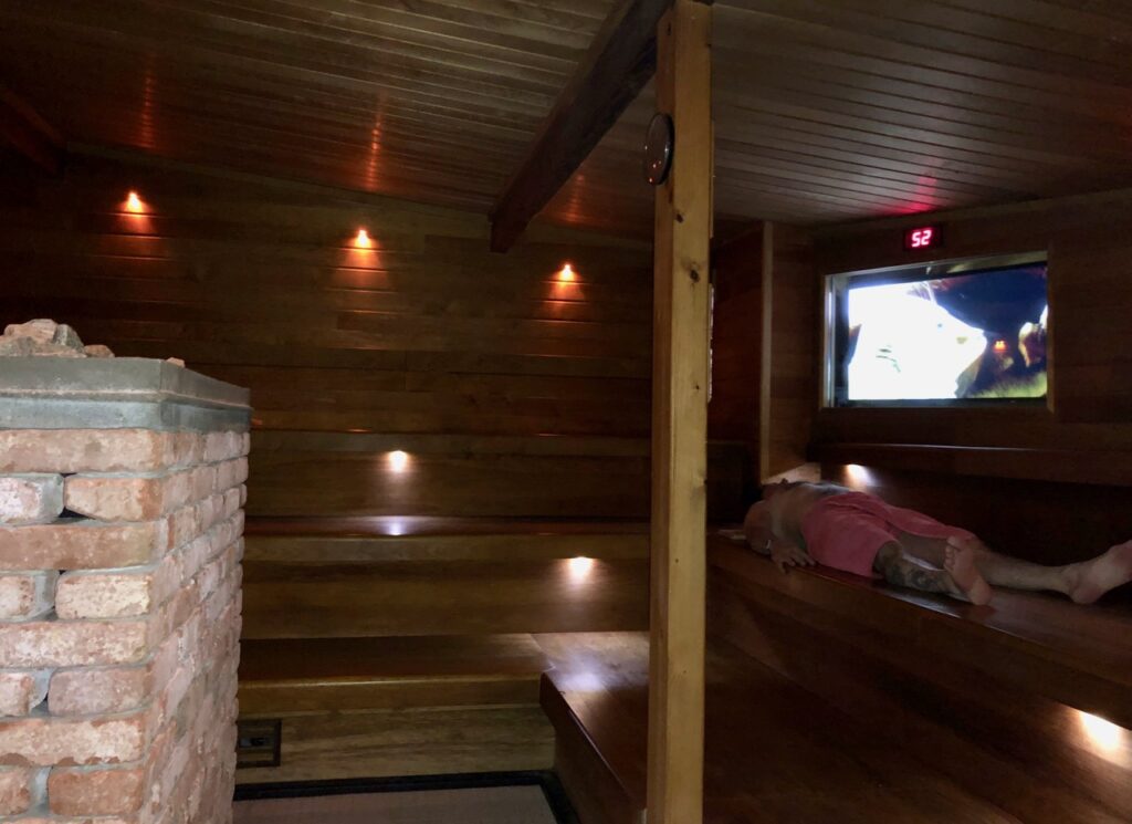 Je n’ai toujours pas bien compris ce qui est bio dans ce sauna. Mais qu’importe. Je l’ai apprécié pour l’espace qu’il offre, pour sa température raisonnable de 60° et pour les images qui défilent sur l’écran. Tranquille, zen…