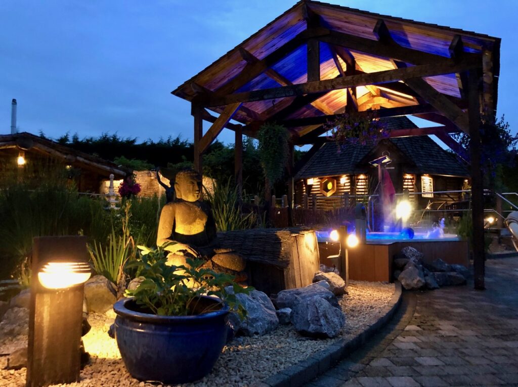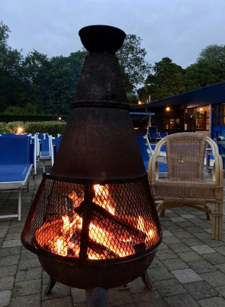 Bonne idée sans doute que ce brasero allumé pour se réchauffer quand la température chute en fin de journée. Mais moi je ne vais pas aux thermes pour vivre une soirée scout autour d’un feu de camp. Je préfère me plonger dans l’eau chaude d’un jacuzzi, m’ébattre dans la piscine ou cuire à petit feu dans un sauna…