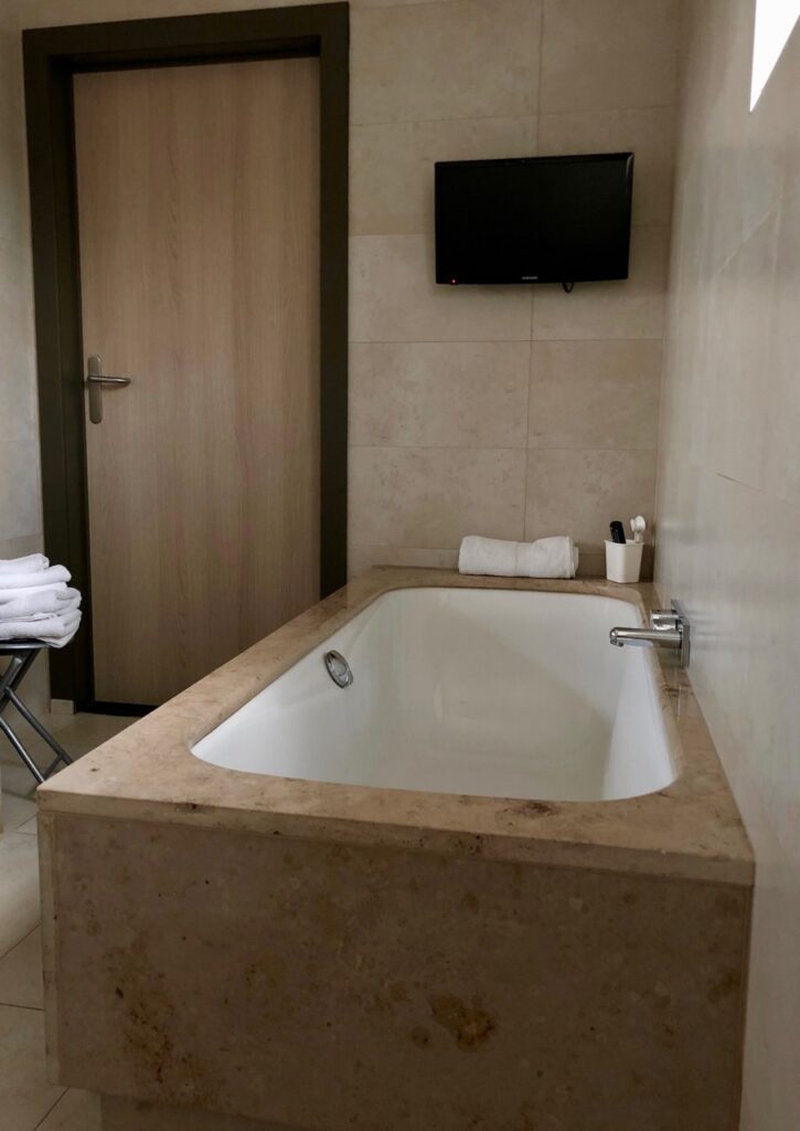 Jolie salle de bain (avec une télé au-dessus de la baignoire !), WC séparés, très grande entrée, une vraie suite pour le prix d’une chambre !