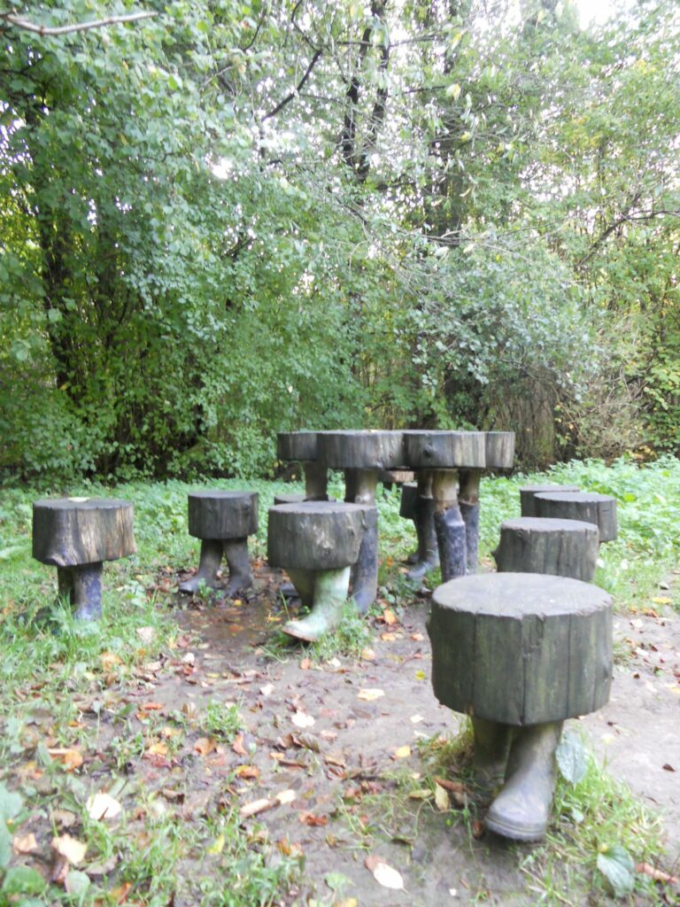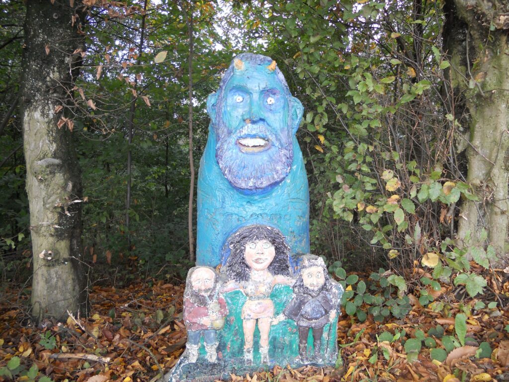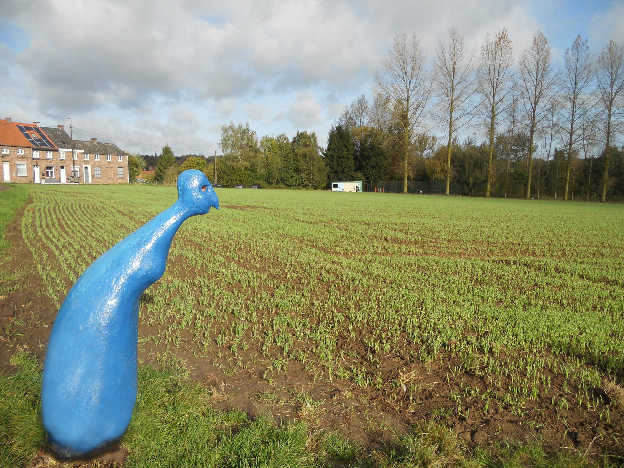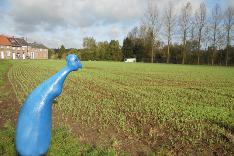 Tous ces êtres surnaturels sont en béton, en plâtre, en bronze ou en plomb et béton… Et il y a même quelques sculptures réalisées avec de vieux outils agricoles. Forcément, on est ici en pleine campagne. Et si on traverse un moment la route Lessines-Renaix, c’est pour mieux longer les champs ou traverser un petit bois.