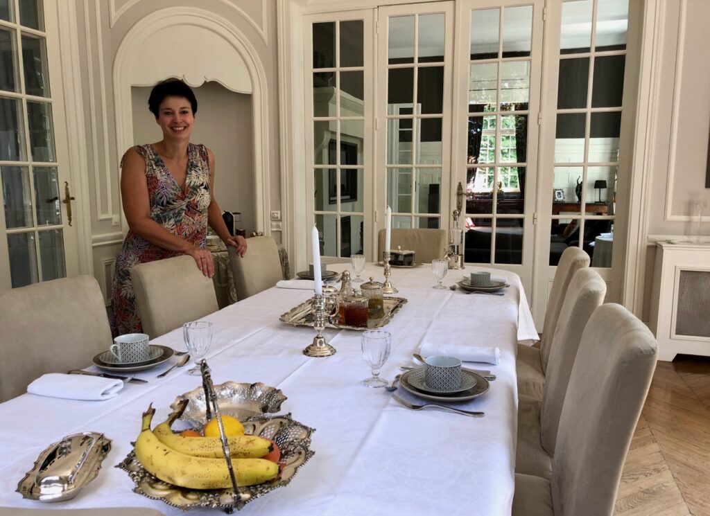On jette un œil à la salle du petit déjeuner, où porcelaine, argenterie et cristal sont déjà prêts pour les réjouissances du lendemain matin. Il paraît que le petit déj comble les envies de salé comme de sucré, avec notamment des fromages et de la charcuterie de la ferme.