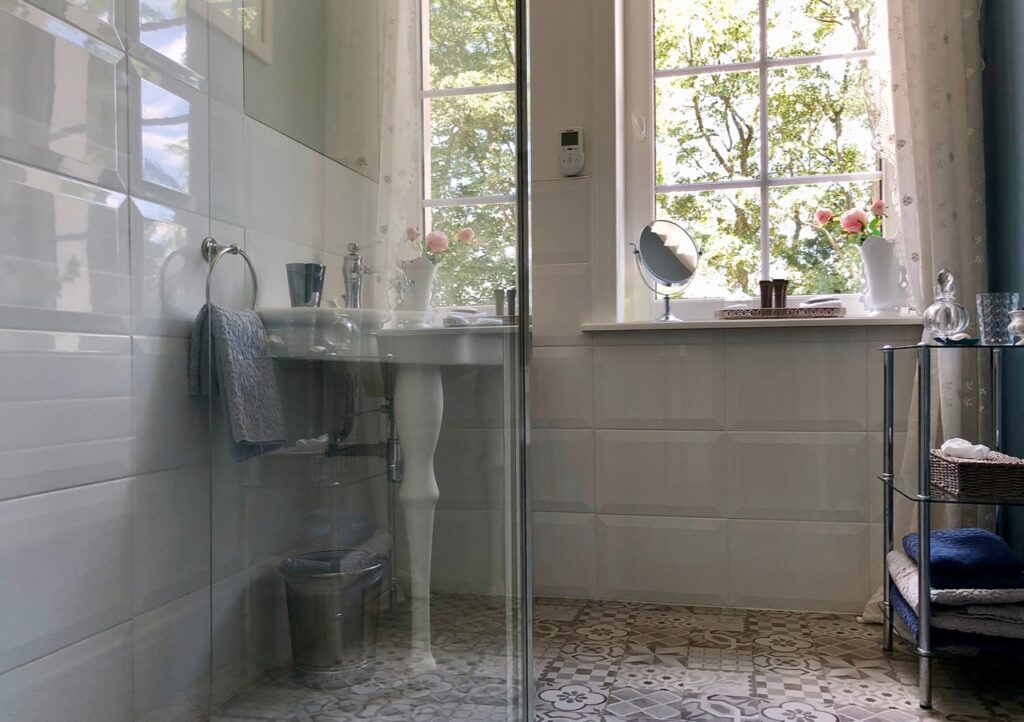 Et, dans la salle de bains, un superbe lavabo Art Déco lui aussi, retrouvé un peu par hasard dans un vide sanitaire !