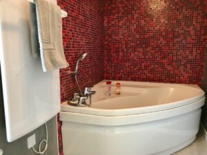 En plus, elle a une belle baignoire d’angle, qui remplacera le jacuzzi extérieur si le temps était vraiment trop horrible. Vous savez ce que c’est parfois ici, quoi qu’on dise…