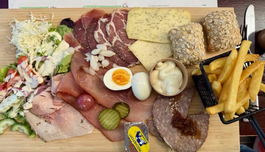 Perso, j’ai pris une planche ardennaise, avec du fromage et diverses charcuteries locales, accompagnés bien sûr de frites et de mayo. Grrr 😡