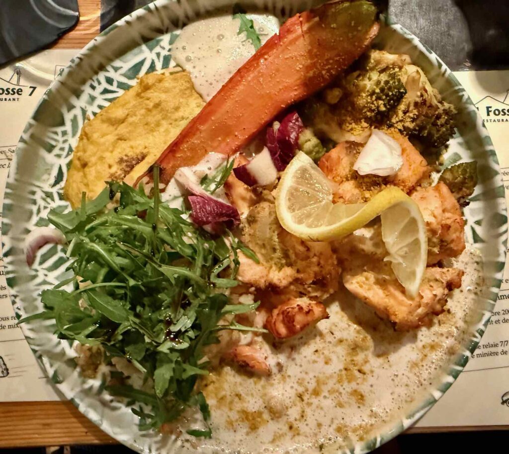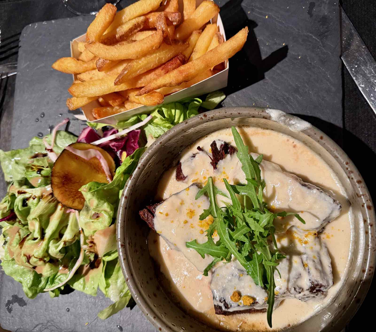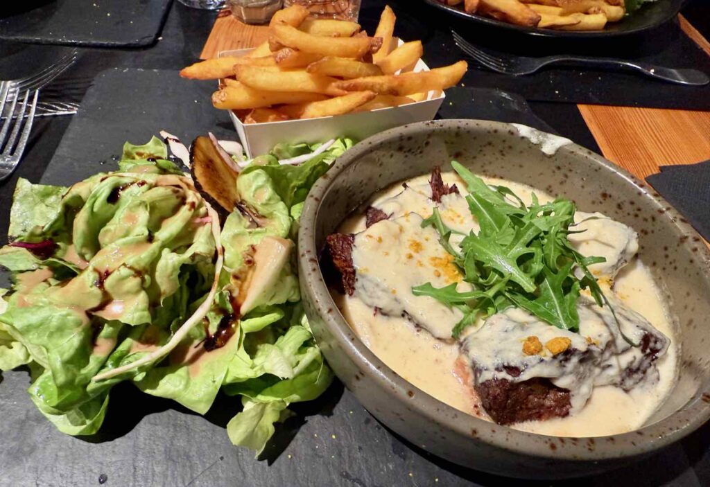 Perso, après la planche apéro partagée (que j’ai oublié de prendre en photo), j’ai mangé une joue de bœuf confite, sauce au maroilles, incroyablement fondante et accompagnée de sa barquette de frites.