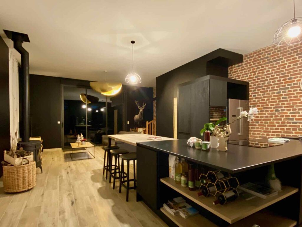Une très belle cuisine noire et brique, contemporaine et très bien équipée, prolonge le salon. Avec toujours une déco sur le thème des Petits Lapins. Et suffisamment d’espace pour être tout le temps ensemble…