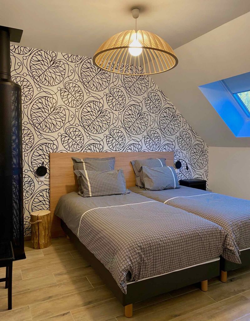 À l’étage du gîte Aux Bois Dorés, un palier à la déco très nordique, une grande salle de bain, des toilettes (il y en a aussi au rez-de-chaussée) et deux jolies chambres, de vrais cocons offrant une literie au top !