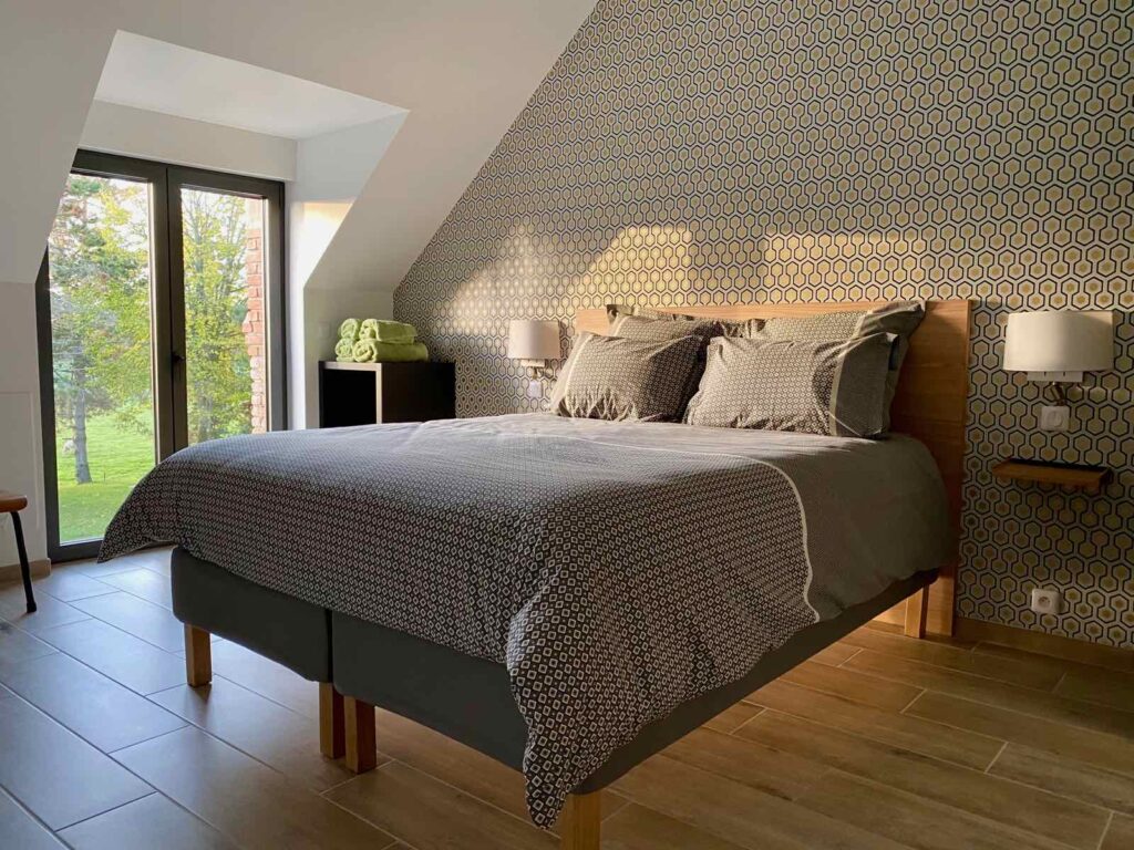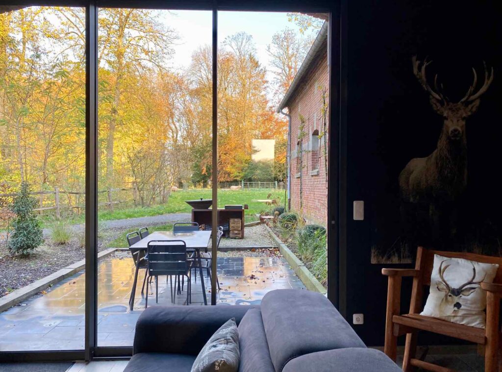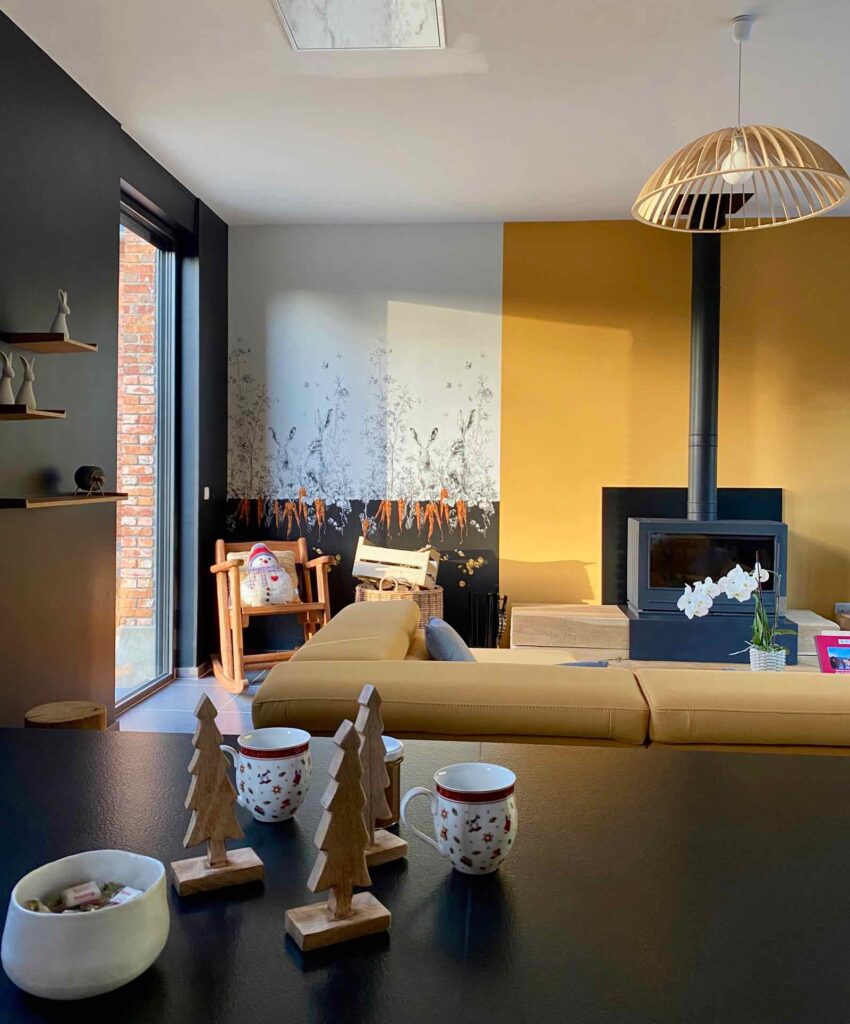L’effet waouh. C’est ce que j’ai ressenti en entrant Aux Petits Lapins, un gîte 4 étoiles, pour deux personnes. Même si le salon est immense et superbement équipé, on ne voit qu’elle. La belle nature, drapée dans ses habits d’automne, qui déploie ses somptueuses couleurs derrière la baie vitrée panoramique. Ici, comme dans le gîte voisin, cette baie est encadrée de noir. « Une astuce déco pour faire plus encore de la nature le point d’intérêt », confie Katia.