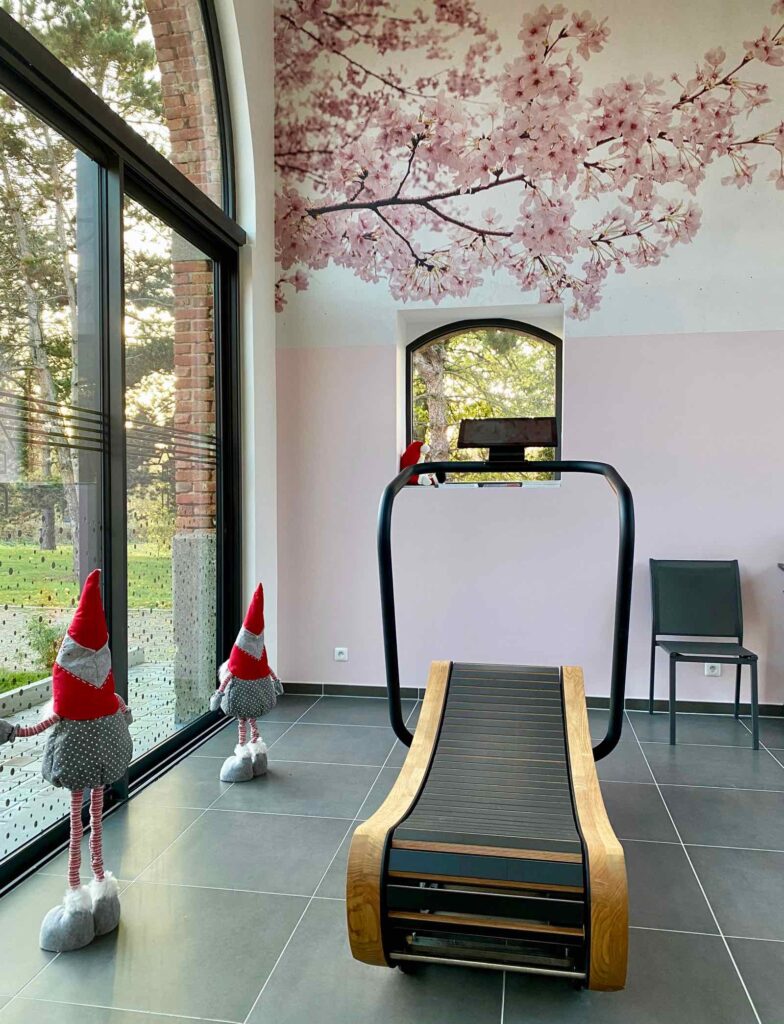 Mais la cerise sur le gâteau, à la Ferme de Sorval, c’est assurément la salle de sport, doublée d’un espace bien-être. Dans l’ancien bâtiment de stockage, Katia a aménagé une salle de remise en forme, avec des machines aussi performantes qu’élégantes !