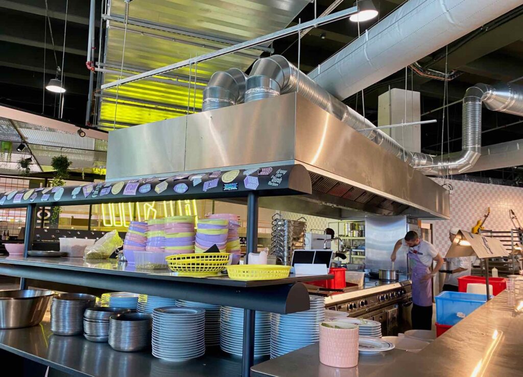 La cuisine ouverte est plantée au milieu de l’immense salle, ce qui assure aussi le spectacle.