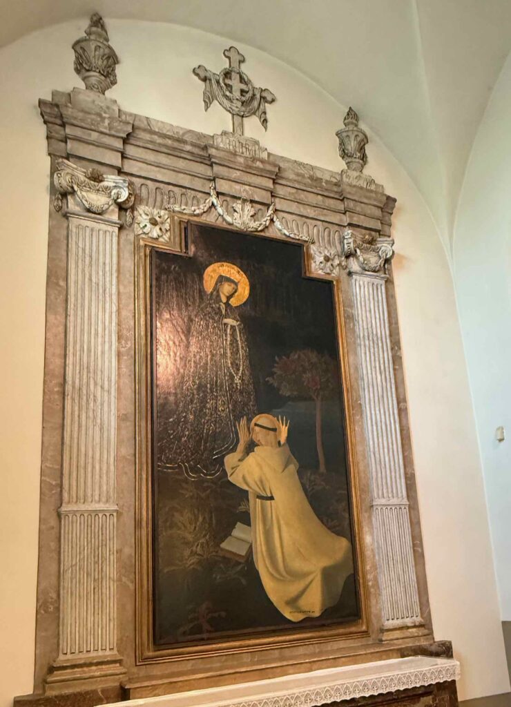 Ainsi qu’un tableau de Notre-Dame donnant le rosaire à saint Dominique, signé Gustav Van den Woestyne. Expression des visages, couleurs sombres et touches dorées : cette œuvre est largement influencée par les Primitifs italiens que ce symboliste admirait.