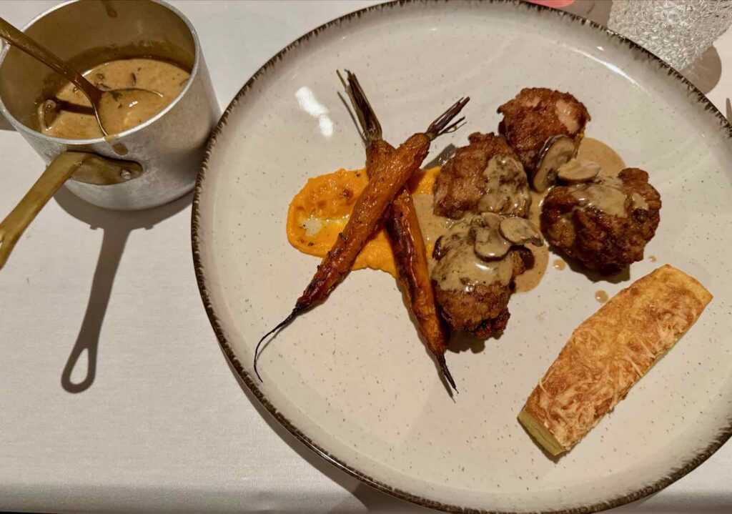 Suivi d’un fabuleux vol au vent au coucou de Malines, ce poulet d’exception made in Flandre. Un vol au vent servi avec de délicieuses frites (et même de la mayo !) mais sans la grosse croûte creuse à laquelle, nous Français, sommes habitués.