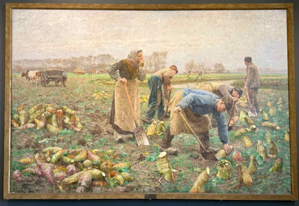 Dans cette Flandre encore très rurale, il a notamment glorifié les paysans travaillant la terre, comme dans la très belle Récolte des betteraves, exposée ici. Affichant d’impressionnantes dimensions (5 mètres sur 3 !), c’est le plus grand tableau de Flandre !